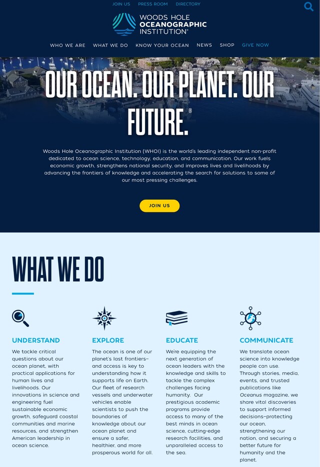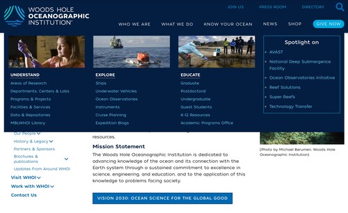 "The ocean is a defining feature of our planet and crucial to life on Earth, yet it remains one of the planet’s last unexplored frontiers. For this reason, WHOI scientists and engineers are committed to understanding all facets of the ocean as well as its complex connections with Earth’s atmosphere, land, ice, seafloor, and life—including humanity. This is essential not only to advance knowledge about our planet… The Woods Hole Oceanographic Institution is dedicated to advancing knowledge of the ocean and its connection with the Earth system through a sustained commitment to excellence in science, engineering, and education, and to the application of this knowledge to problems facing society."
