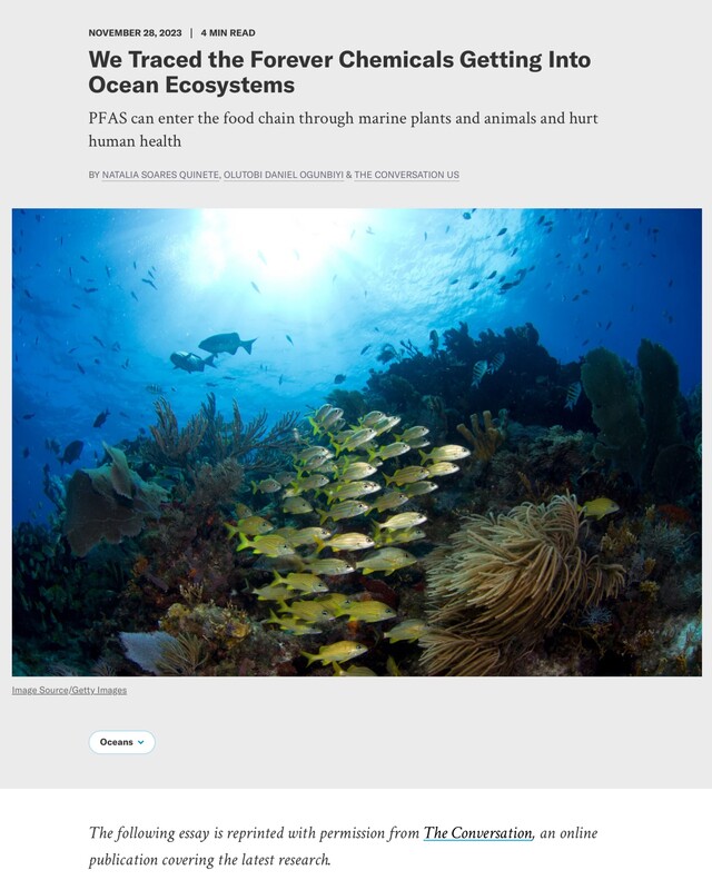Degraded plastic pollution (MP & NP) particles are consumed by microscopic plankton and subsequently by bivalves, fishes and marine mammals, whales and even seabirds. Through bioaccumulation they collect in the bodies of all organisms. Biomagnification occurs and concentration increases at higher levels as contamination moves up the food chain to the top predators. Humans obviously are at great risk.